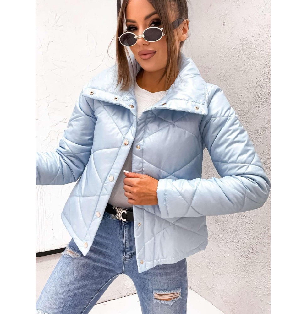 Žydra  trumpa striukė su kaklu, užsegimas šponkėm, apačioje ties klubais nėra aptempta.